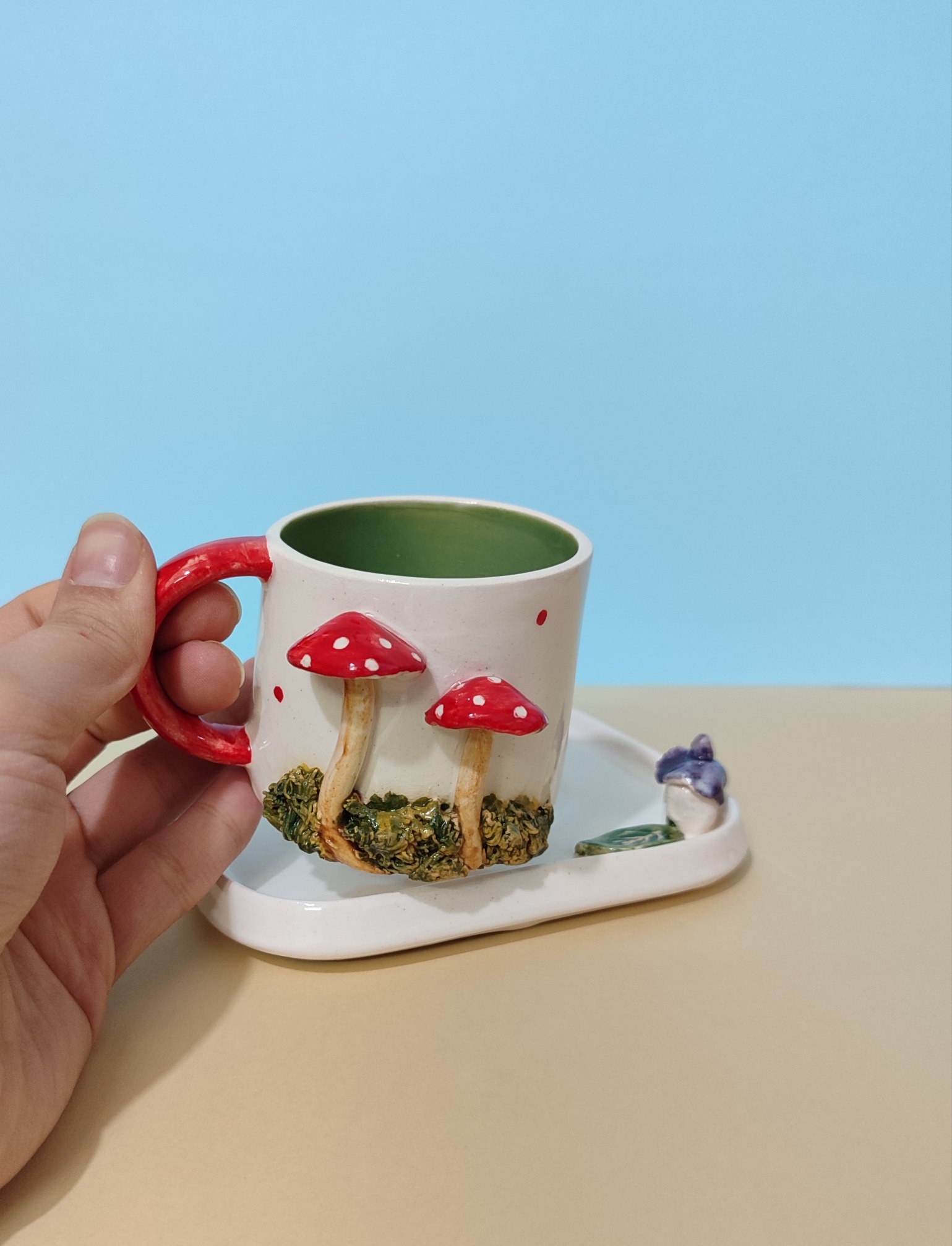 ماگ با طرح قارچ 🍄 ساخته شده با دست اندازه: دهانه:۵/۵ ارتفاع:۶ اندازه زیرماگی: ۱۲/۵در۱۲/۵ (ساخته شده با متریال و سرامیک درجه یک)