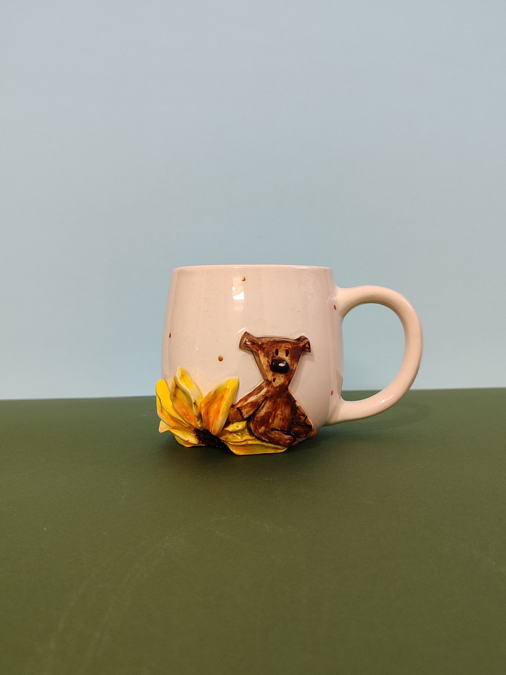 ماگ سرامیکی با طرح برجسته مستربین و گل آفتابگردان🌻🌻 دستساز اندازه: ماگ: ارتفاع:۹ دهانه:۸ جنس:سرامیک درجه یک
